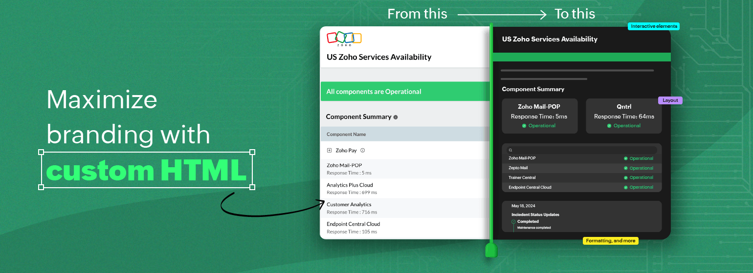 A status page with a well-defined brand presence can transform challenges into opportunities to reinforce trust. This can be achieved by incorporating custom HTML and CSS so you can restructure your status page into a powerful branding asset.