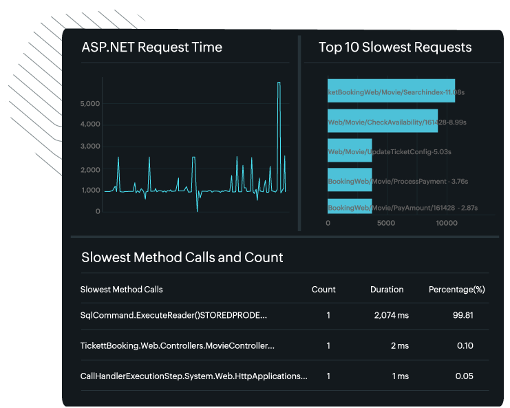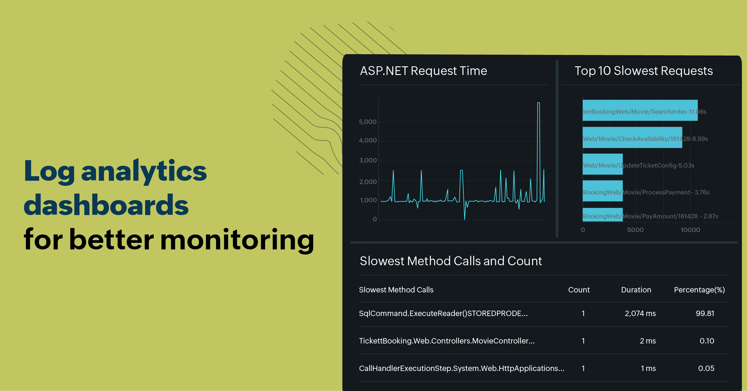 Custom dashboards are essential tools for achieving comprehensive observability, combining critical metrics, logs, and traces into a unified view. For instance, while monitoring a Microsoft Internet Information Services (IIS) web server, metrics such as ASP.NET request time offer a broad perspective on server responsiveness, aiding in the identification of performance bottlenecks. Logs, like the Top 10 slowest requests, provide detailed insights into the specific requests causing delays, helping to trace recurring problems. Traces further enhance visibility by mapping the journey of each request and highlighting the slowest method calls that might be impacting performance.