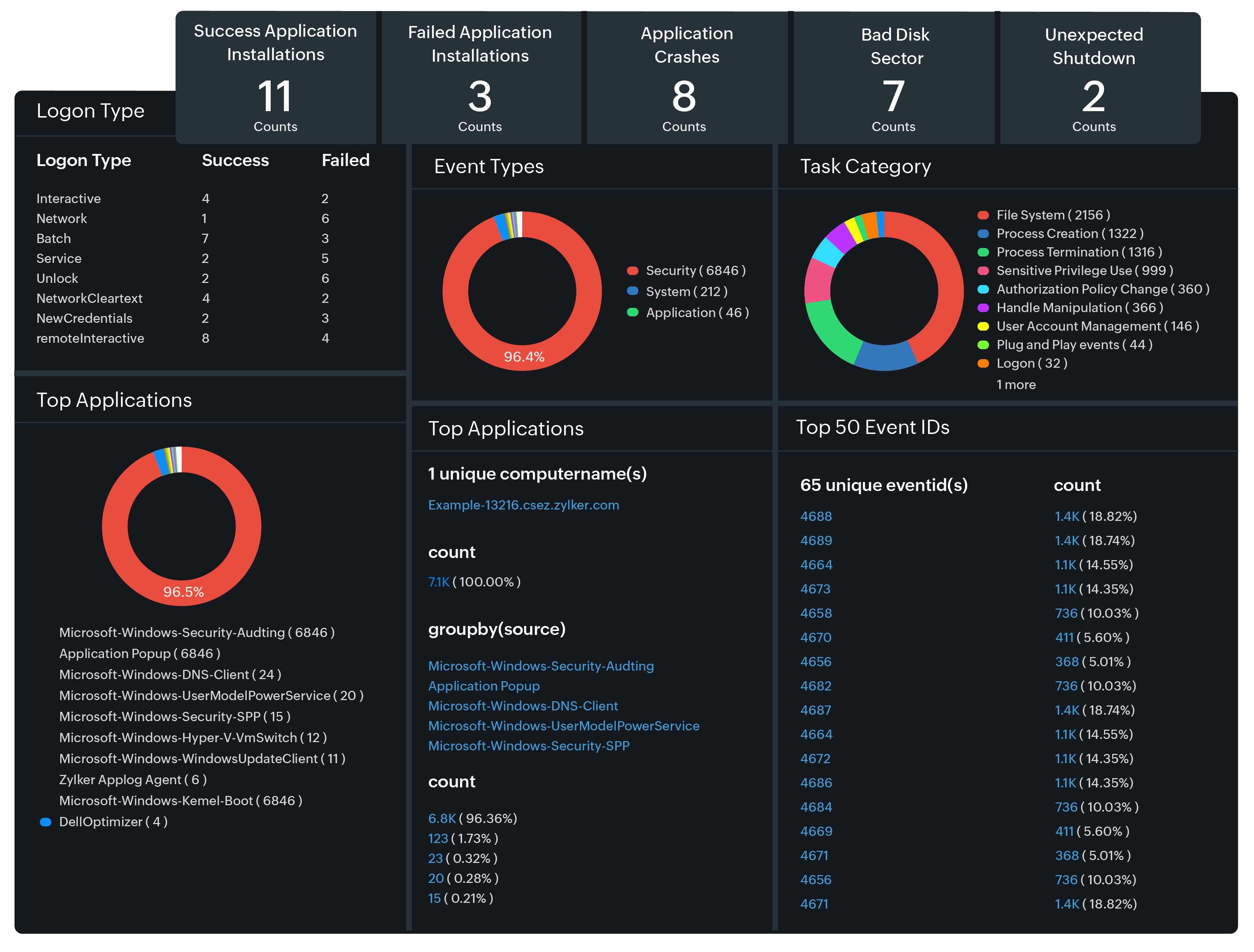 Metrics such as Application Crashes, Unexpected Shutdowns, Logon Stats, and Top Event IDs focus on core operational insights, making them ideal for monitoring application stability, security, and usage trends.