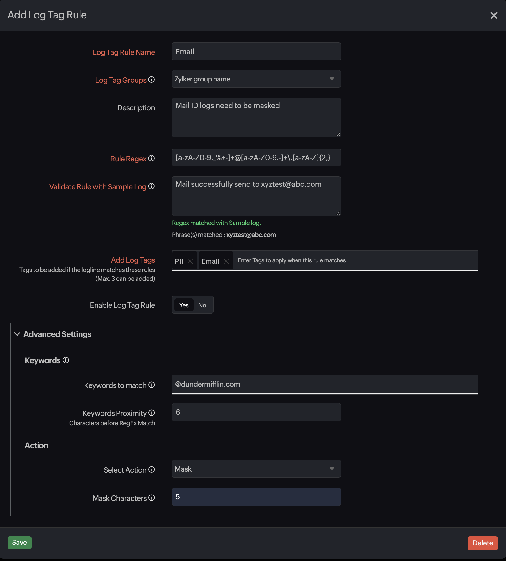 Before transmitting the logs to the cloud, the tagging rules are applied to mask the PII data. For example, an email address will be masked and given a partially redacted name, such as z*****@zylker.com, ensuring compliance while preserving analytical usefulness.