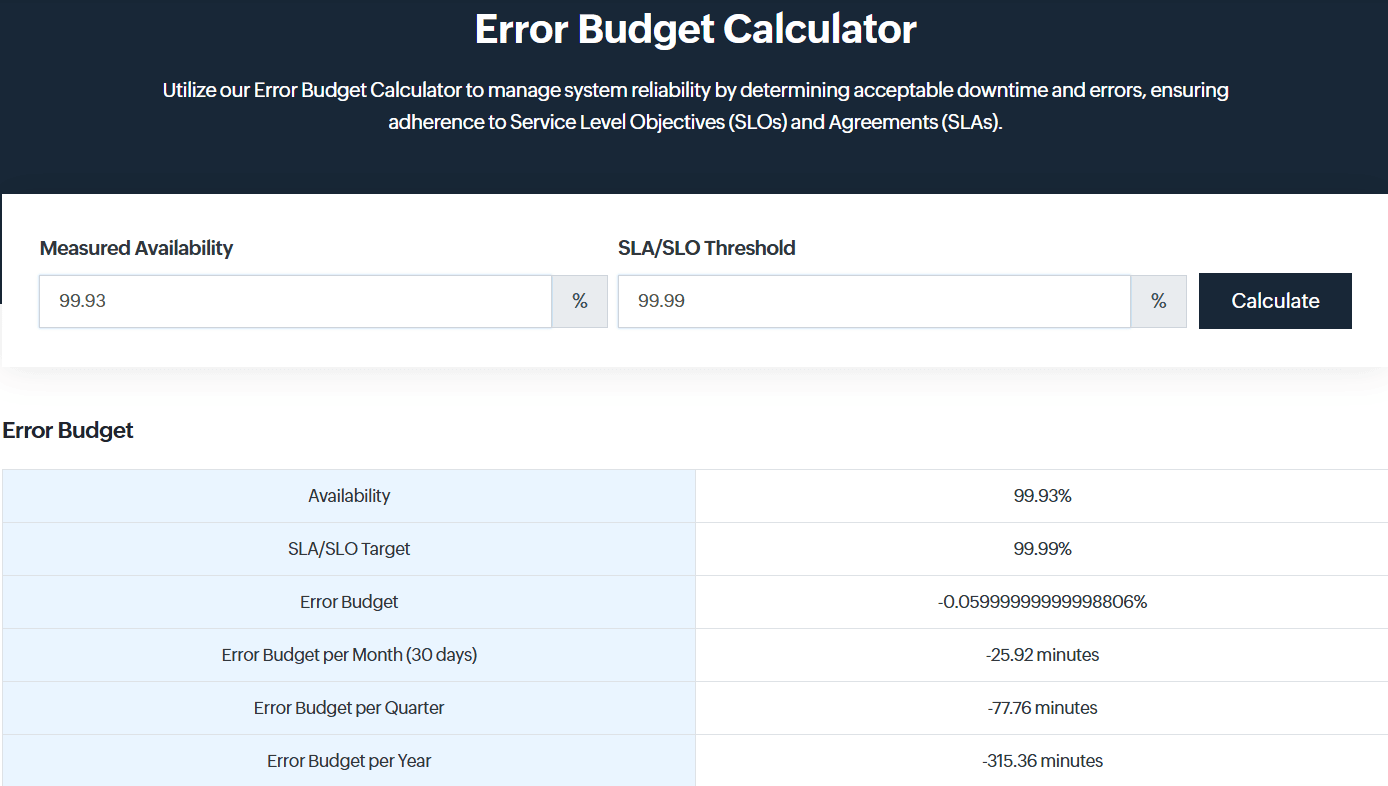Think of an error budget as a safety cushion. It’s the amount of wiggle room you have for system downtime or performance issues. Derived from your SLOs, the error budget quantifies how much imperfection is acceptable. You can easily calculate your site's performance in a time period against the agreed upon SLOs using this error budget calculator.