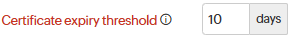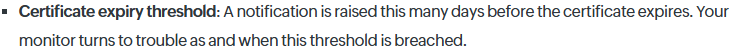 Alternatively, the "Certificate expiry threshold" in the monitor's properties (shown below; same name as that which is used in the threshold profile; naming them differently would clarify functionality) would be limited to only sending a notification and not changing the monitor to a Trouble state. Alerting would then be controlled exclusively by the threshold profile.