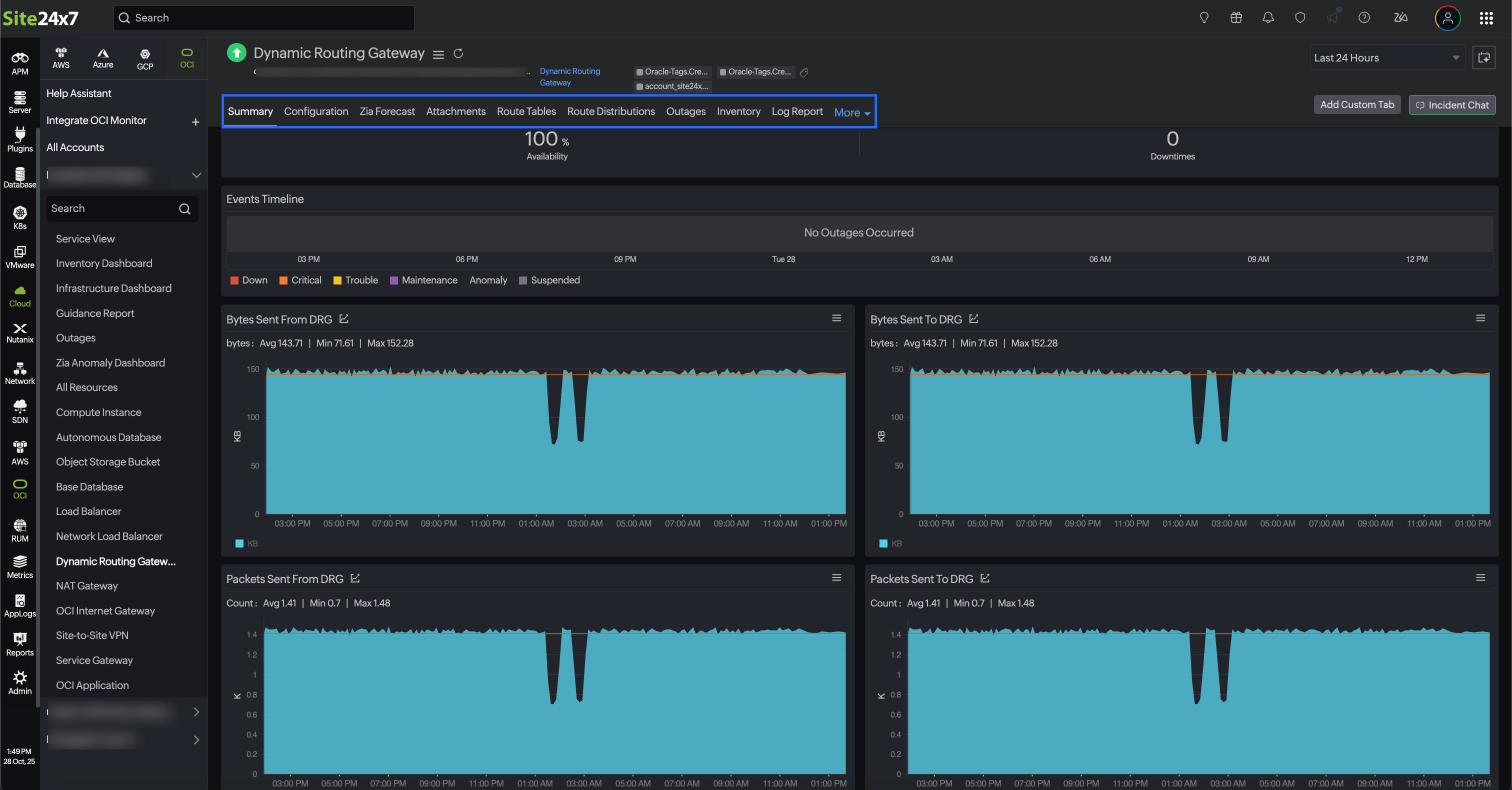With Site24x7’s integration for OCI DRG, you can now gain complete visibility into your network connectivity across Oracle Cloud. Integrate your DRG with Site24x7 and leverage the following benefits: