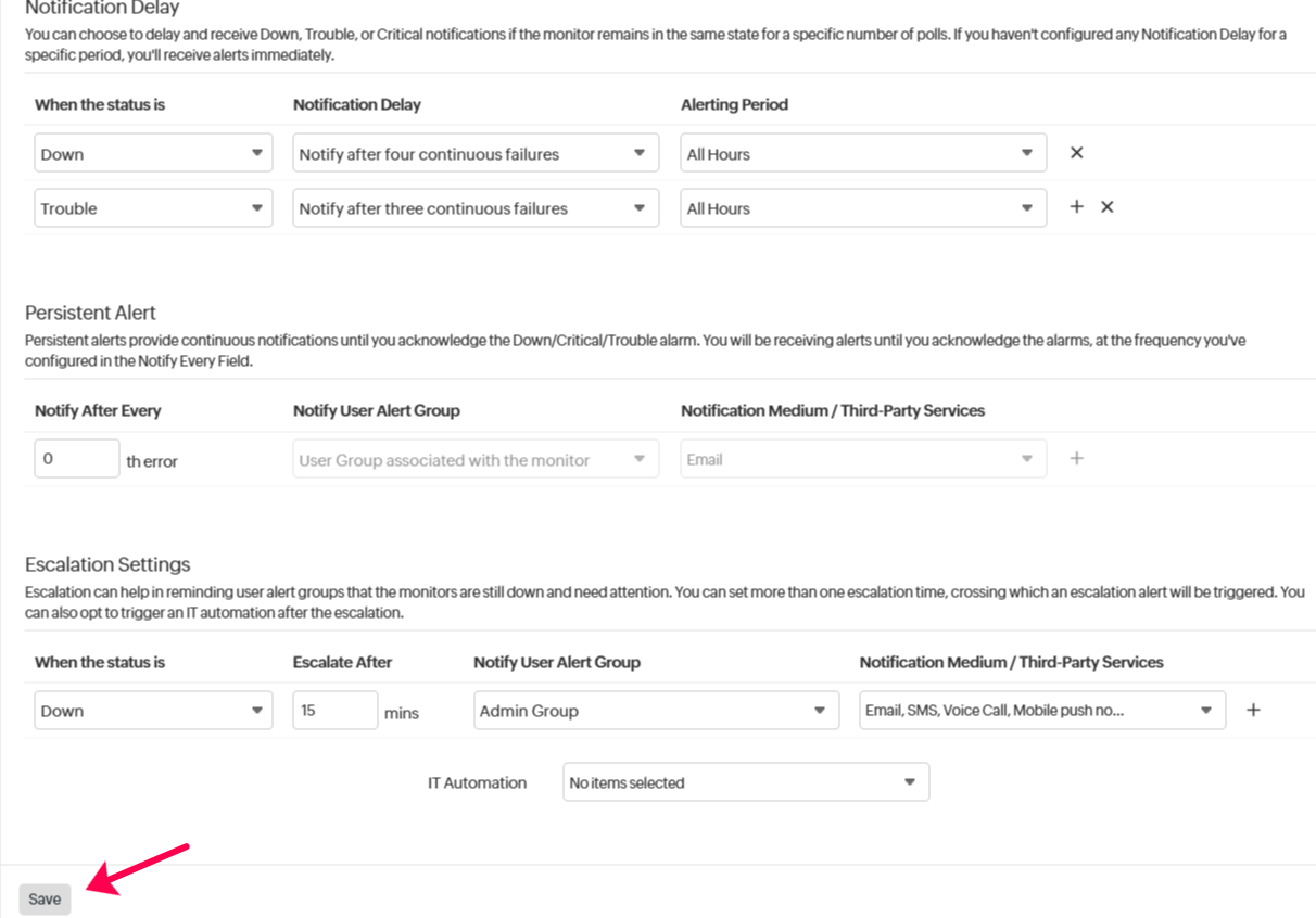 3. From the 'Notification Delay ' section, you may configure the required condition by selecting from the 'Notification delay' & 'When the status is' fields and add new cconditions for more status
