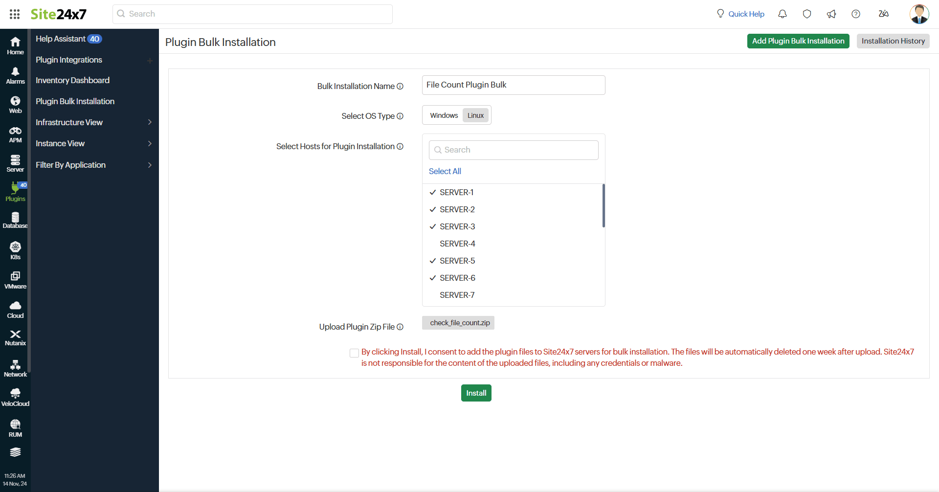We are pleased to announce that you can now install a plugin on multiple servers simultaneously using the Site24x7 web client and streamline the plugin deployment process.