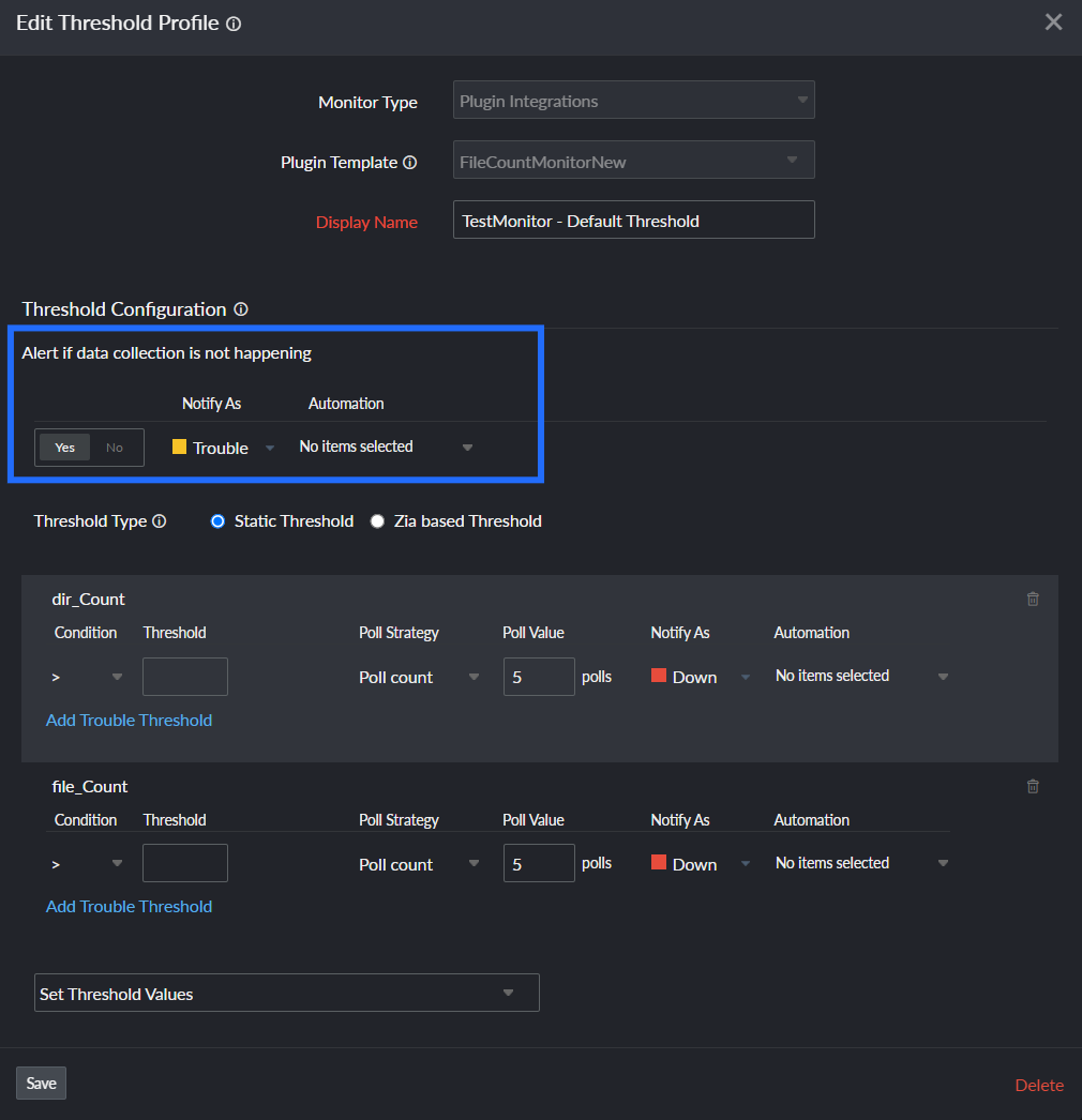 - In the Edit Threshold Profile pop-up, switch the toggle to Yes for the Alert if data collection is not happening option.