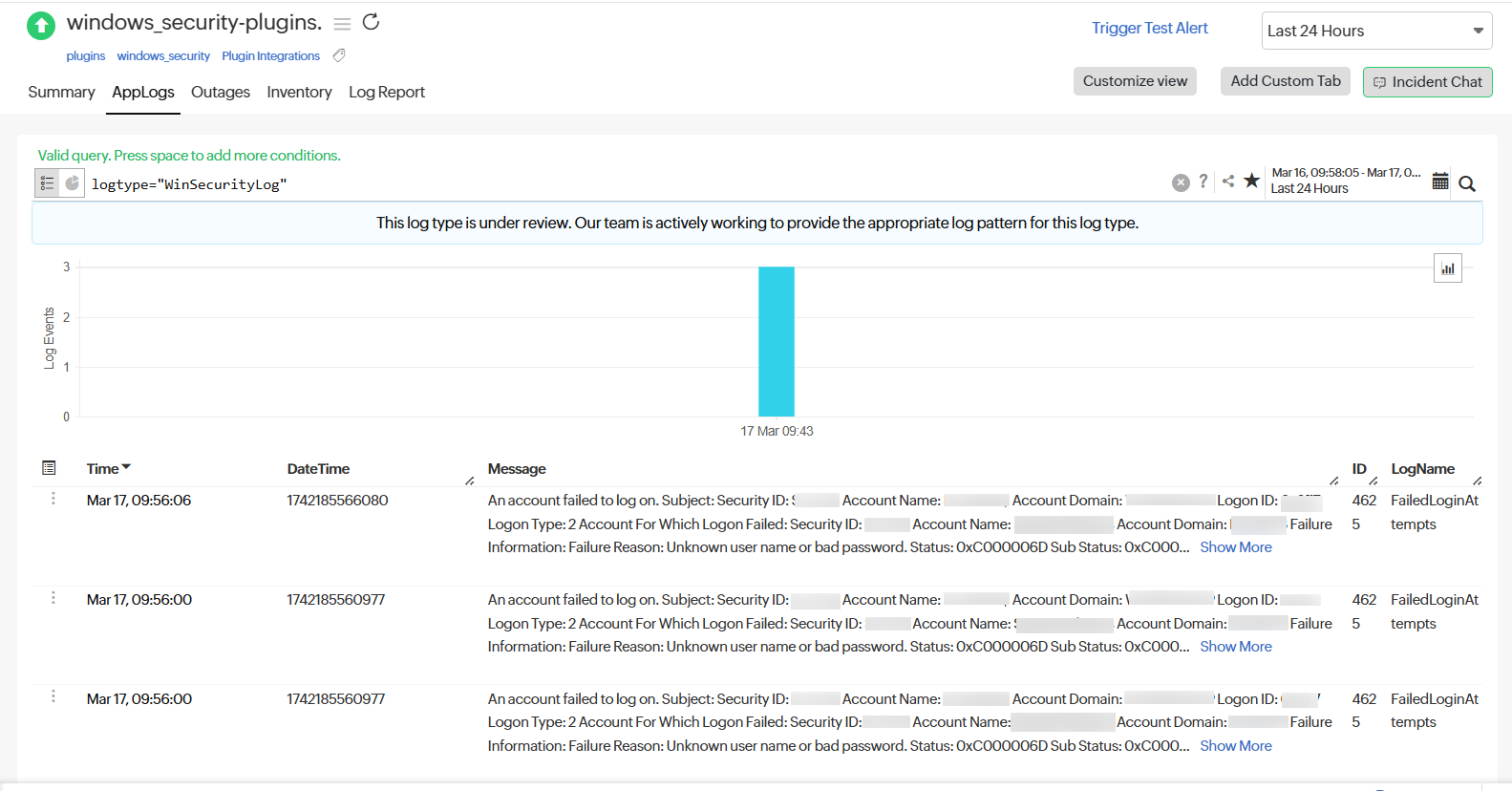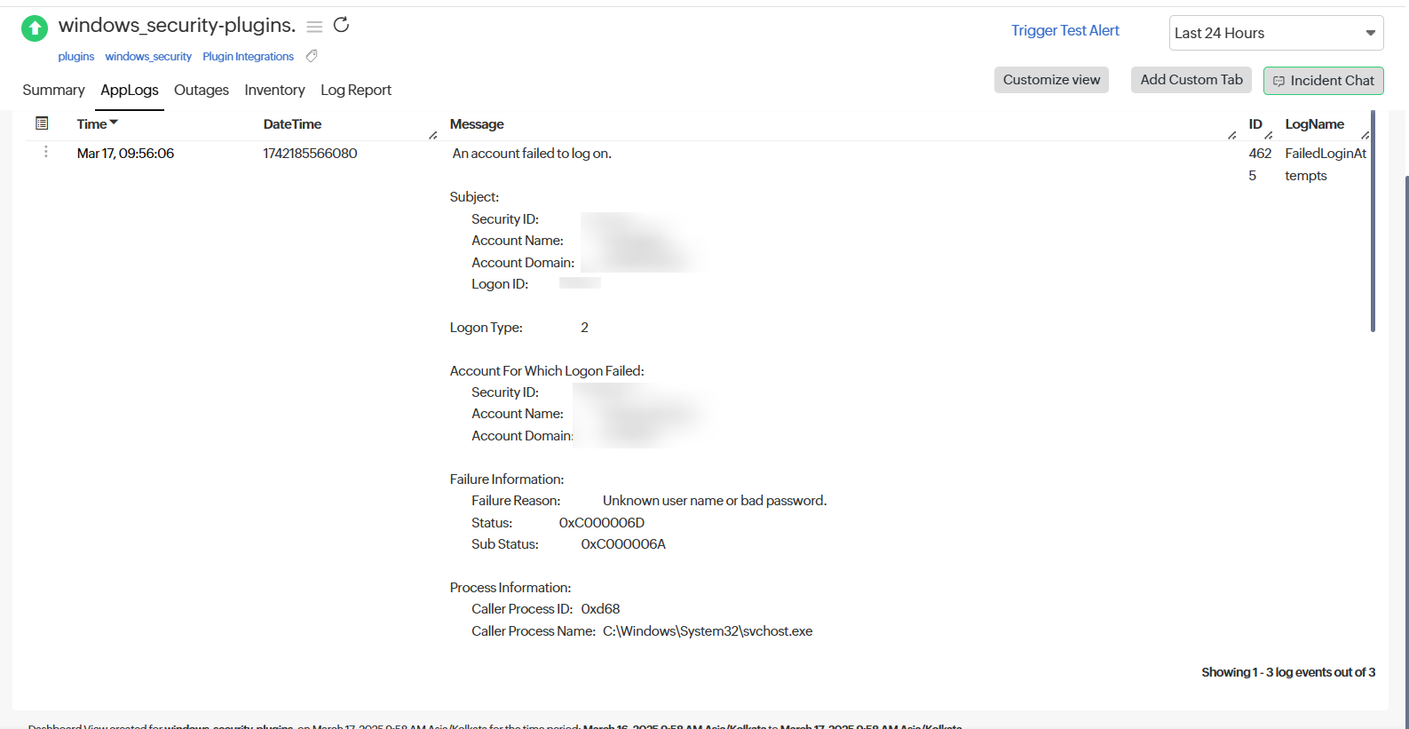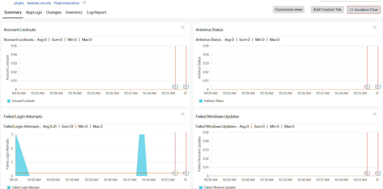 The Windows Security Monitoring plugin provides real-time insights into critical security events, including failed login attempts, account lockouts, malware detections, and antivirus status to help prevent unauthorized access and cyberthreats. It also tracks pending and failed software updates, security threat responses, and malware remediation failures, ensuring your system stays protected and up to date. Users can also check logs using the AppLogs tab within the plugin for more detailed insights.