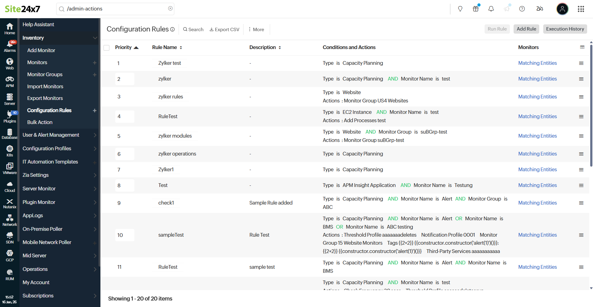 Configuration Rules can be applied to all monitors types in Site24x7. Rules can be configured and associated with existing monitors. Additionally, when a new monitor is being added, you can run a check, and associate any of the previously created rules that match the monitor configurations.