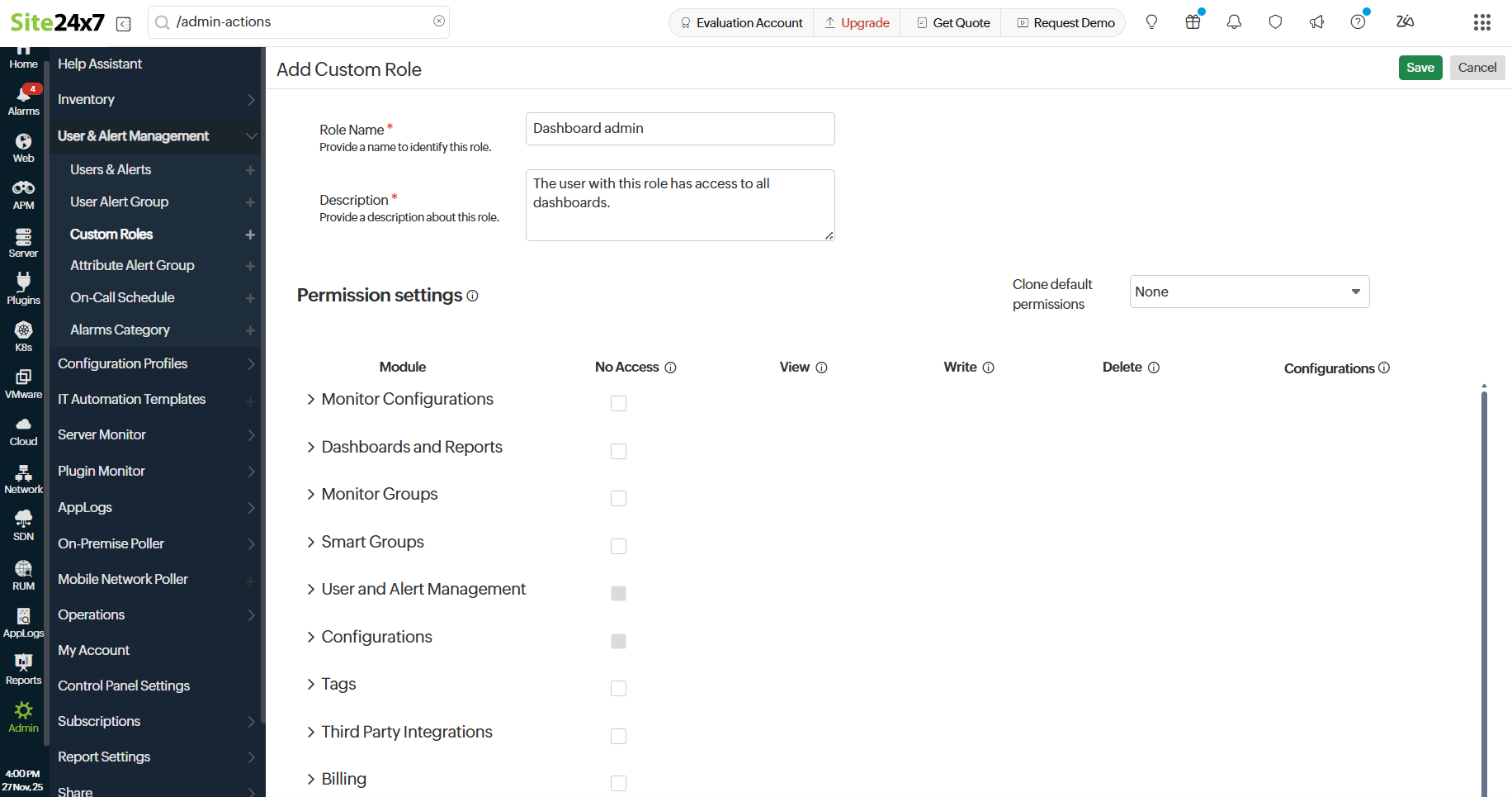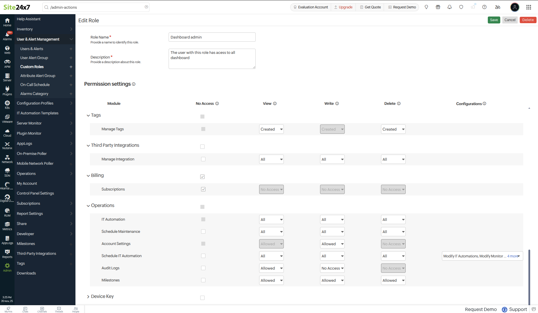 - Custom Role is available only for customers using Elite and Enterprise pack in Site4x7.