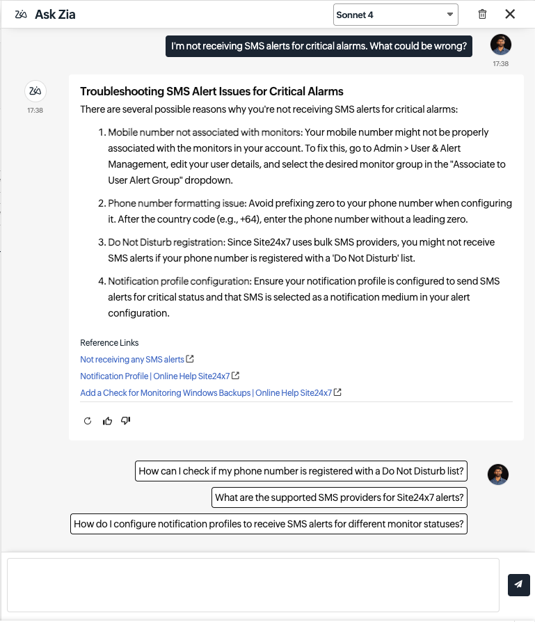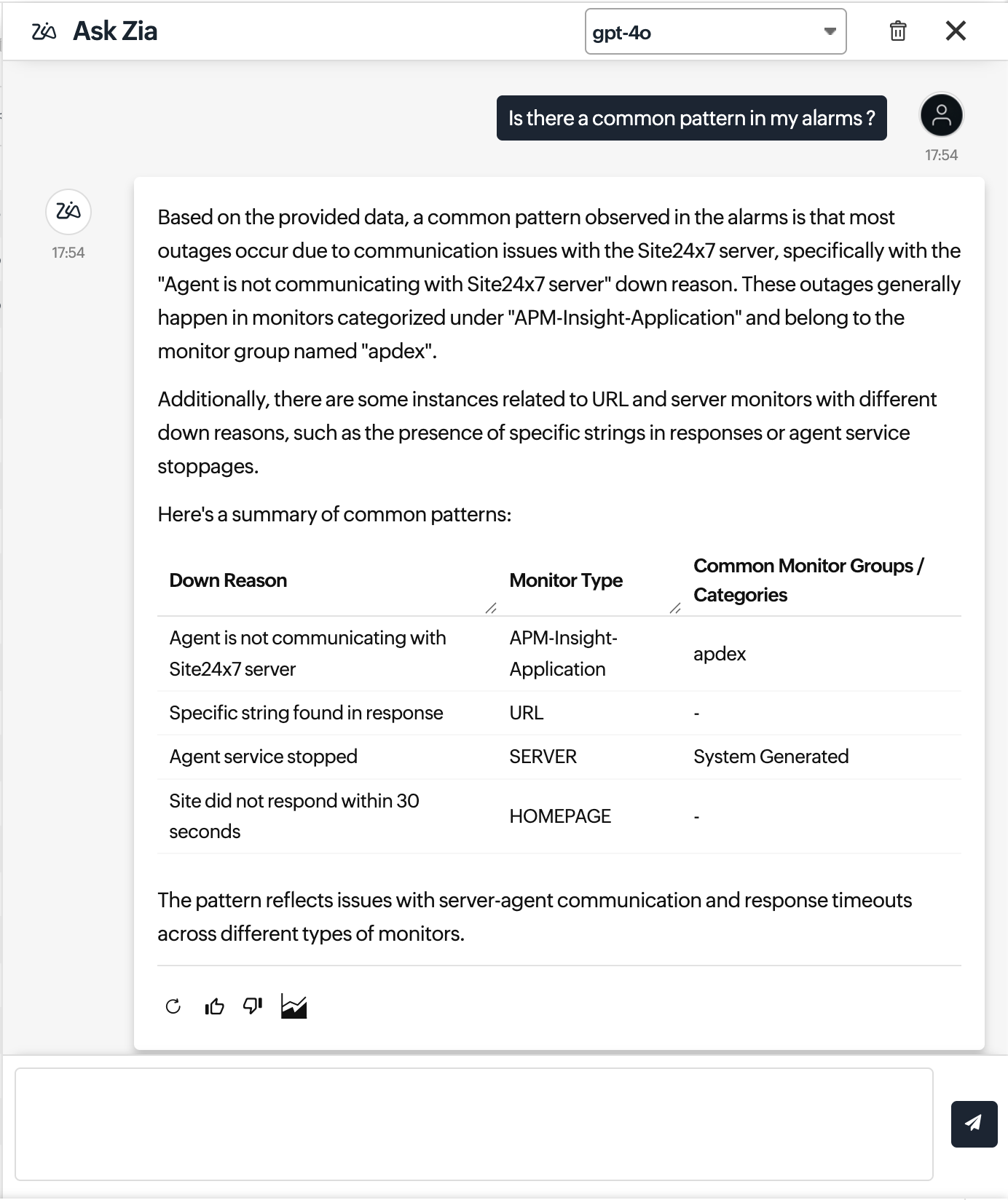 Ask Zia is available across multiple feature pages in Site24x7, enabling you to quickly retrieve monitor insights without navigating through different tabs.
