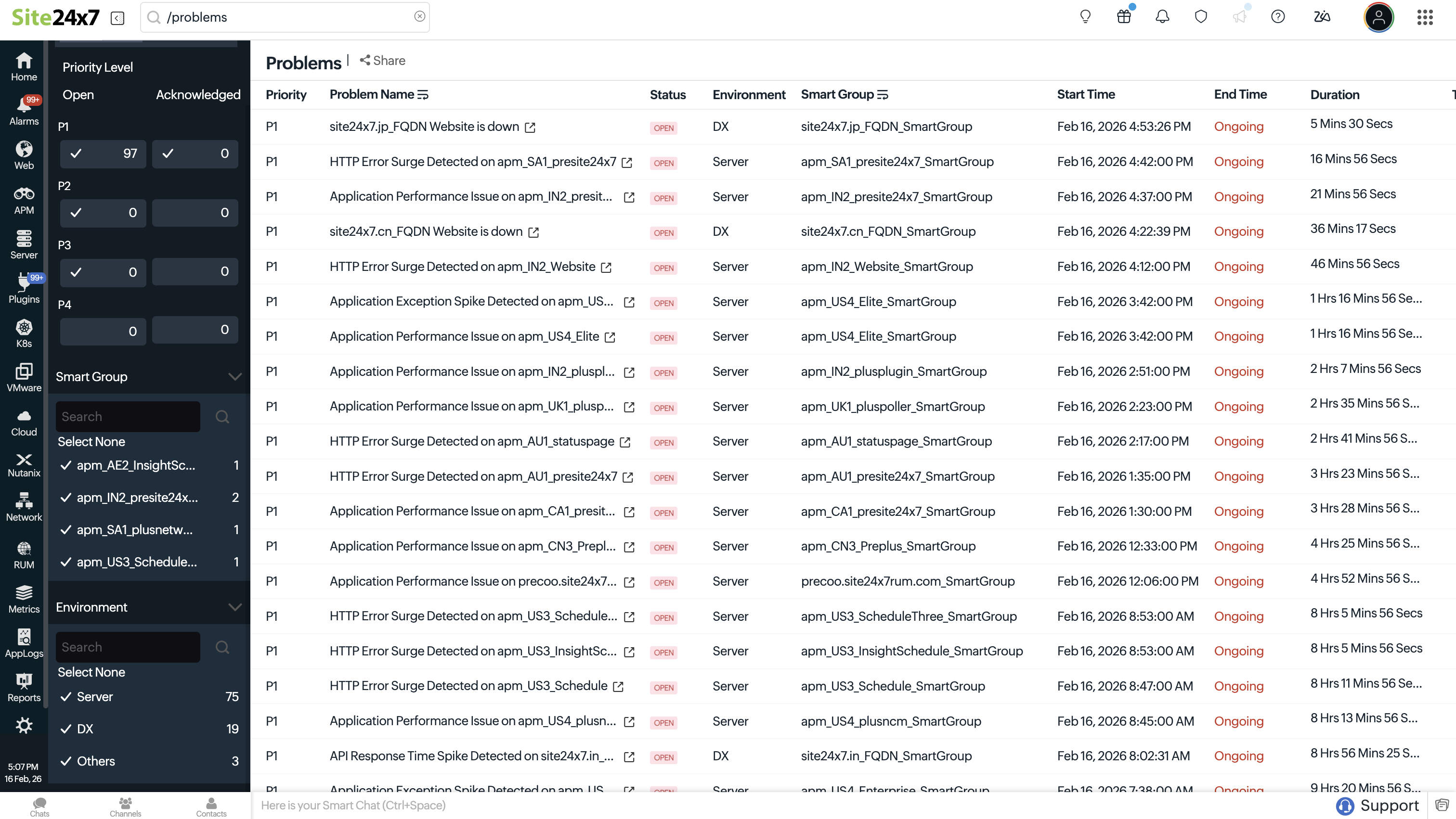 - View the count of unacknowledged and acknowledged Problems in the Open and Acknowledged tabs. The priority of the problems is system-determined and you can filter problems based on their priority.