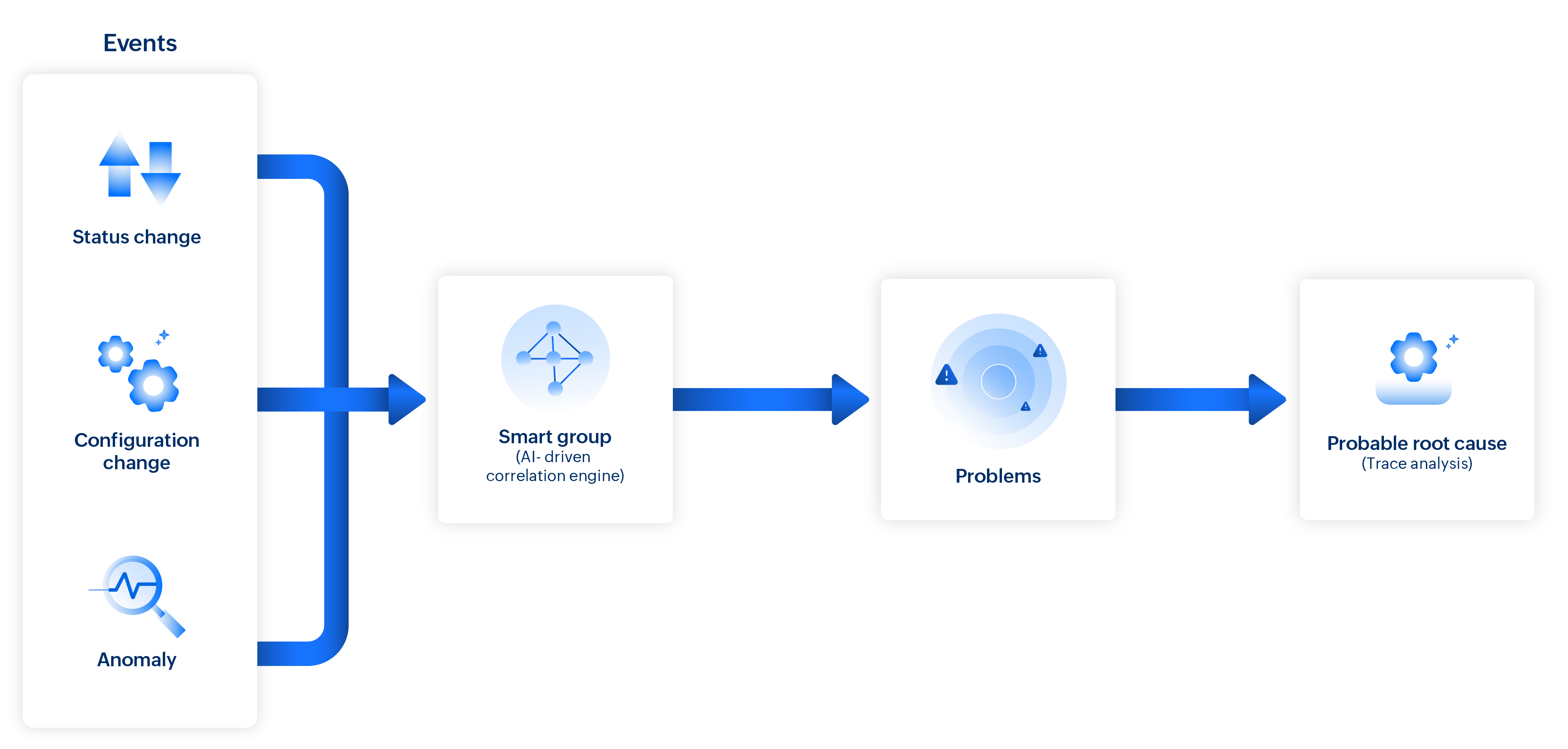 Through domain-aware correlation, the system maps the knowledge of specific environments, such as applications, to connect events with deeper context. Causal analysis then evaluates event timelines, dependencies, and behavioral patterns to trace back to the most likely root cause. This ensures that critical issues are surfaced as prioritized problems that need attention, while unrelated or low-impact events are filtered out phenomenally, minimizing the events count.