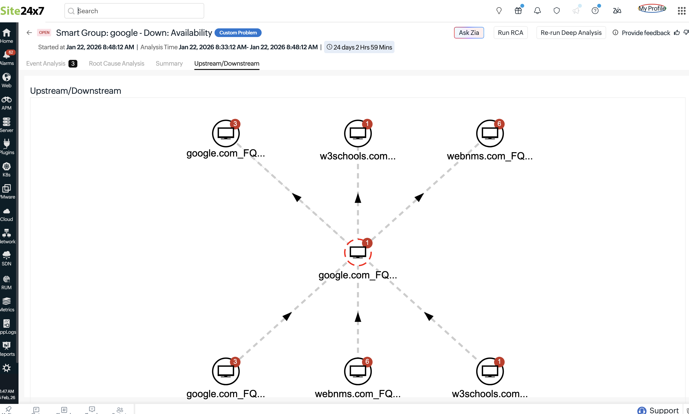 When infrastructure or performance issues such as a monitor going down or a spike in response time occur, Site24x7 gathers events and monitor statuses from the Smart Groups. Events are grouped based on their relevance and timing to determine whether they are symptoms of a larger underlying issue.