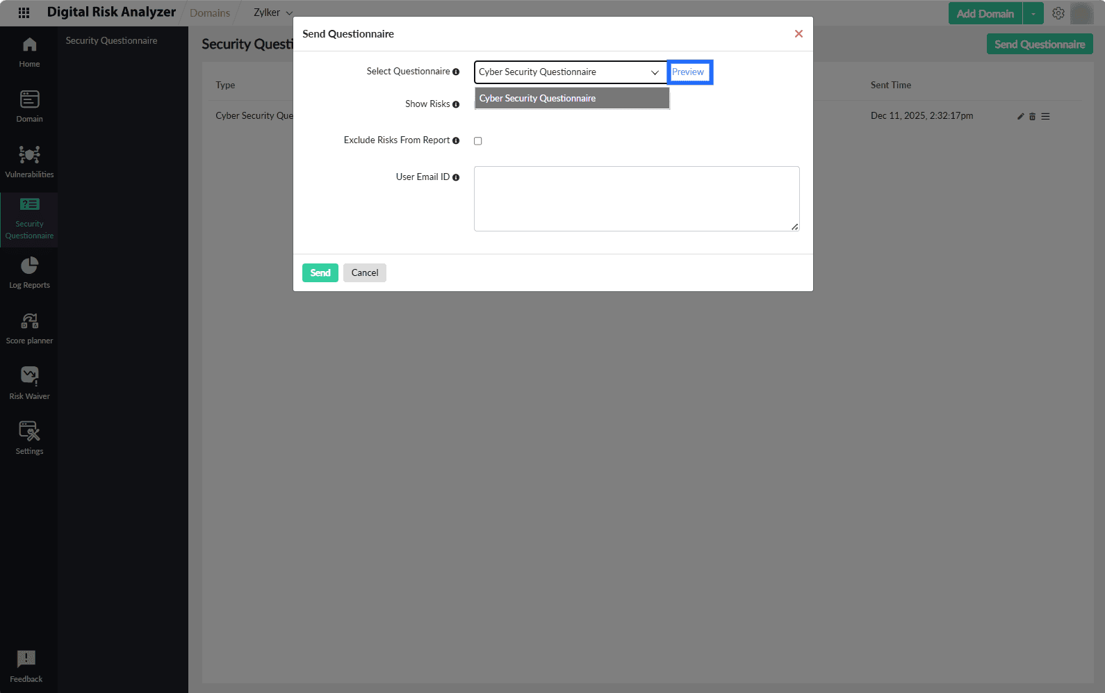 - In the left navigation menu, navigate to Security Questionnaire > Send Questionnaire.