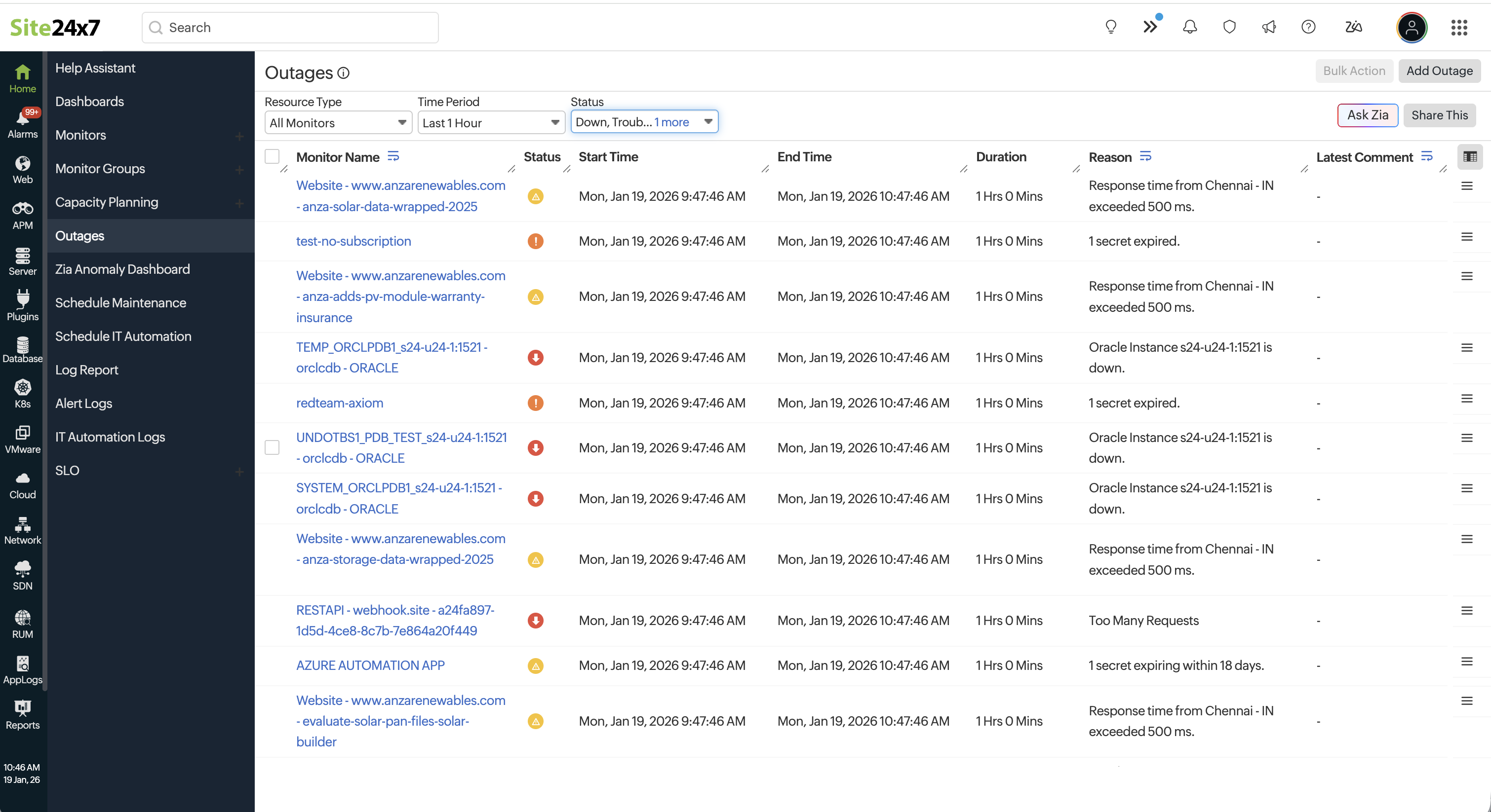 - Add Outage: You can choose to add an outage manually with the Add Outage option. Instantly gain insights into all outages related to your monitors over a specific period using Ask Zia. Get a summary of details like incident start and end times, outage duration, monitor name, and the reason for downtime to troubleshoot incidents quickly and efficiently.