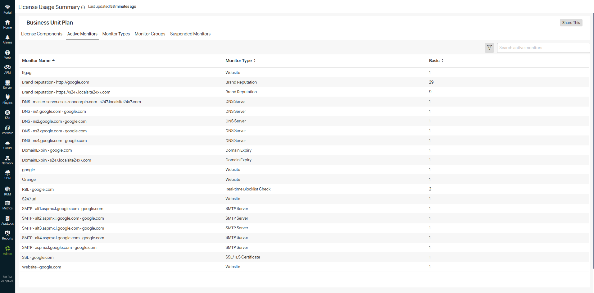 - Suspended Monitors: View the suspended monitors that no longer consume licenses. The usage numbers indicate the licenses required to reactivate them. Click the icon to Activate, Delete, multi-select, and take bulk action on them.